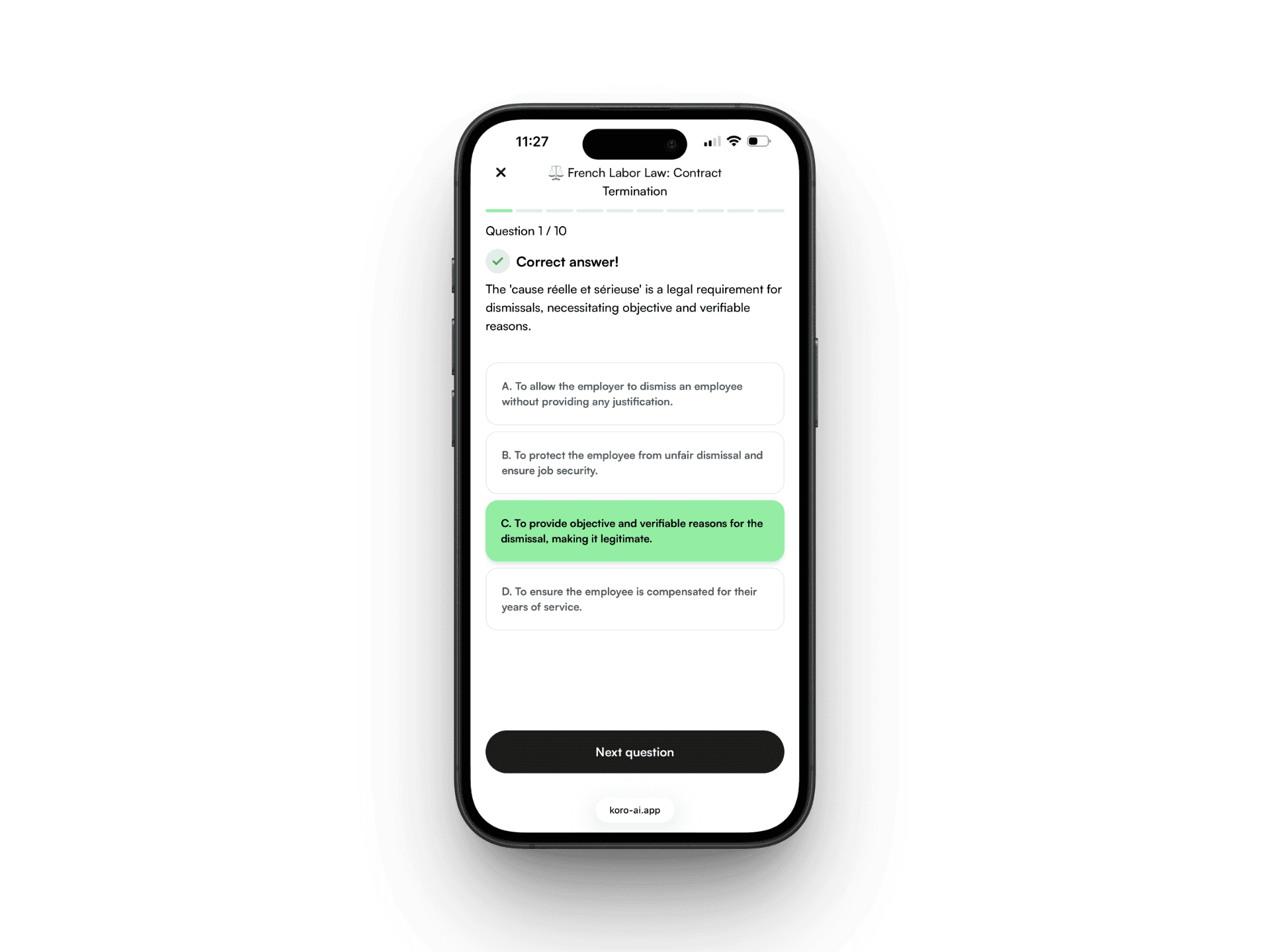 Koro acts as an intelligent revision companion. It structures your work, offers reminders, and encourages you to progress step by step. You are no longer alone in your preparation.